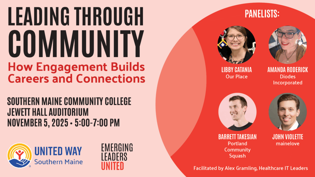 Join Emerging Leaders United on November 5 for an interactive panel discussion on building careers and connections through community engagement. Panelists will share stories and perspectives on how volunteerism and advocacy helped them expand their networks, grow their careers, and make a lasting impact in Southern Maine.